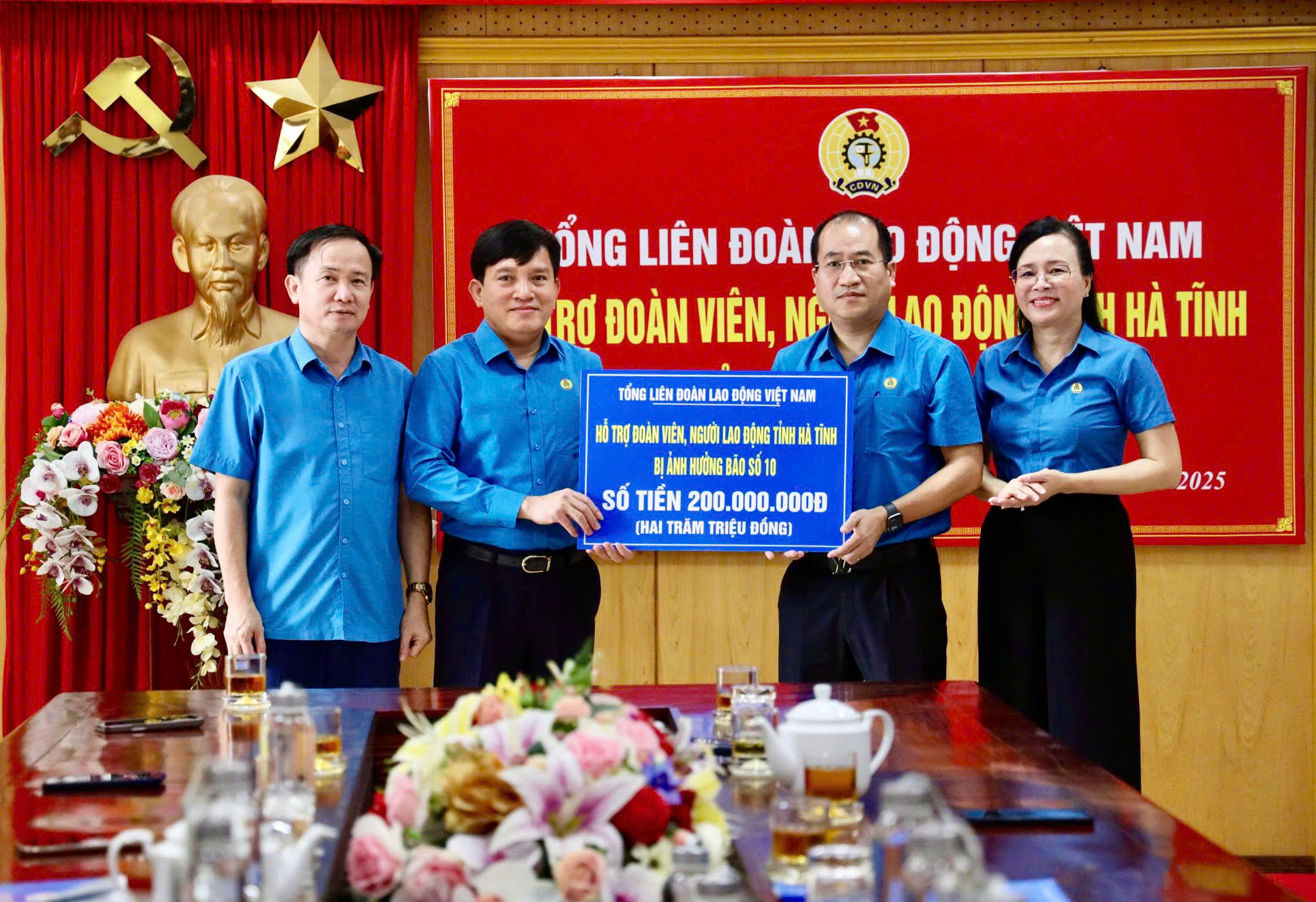Tham dự có đồng chí Nguyễn Thế Hoàn - Tỉnh ủy viên, Phó Chủ tịch Ủy ban MTTQ Việt Nam tỉnh, Chủ tịch LĐLĐ tỉnh, các đồng chí Thường trực cùng cán bộ chuyên trách công đoàn. Dịp này, Tổng Liên đoàn Lao động Việt Nam đã trao 200 triệu đồng hỗ trợ đoàn viên, người lao động toàn tỉnh bị thiệt hại do ảnh hưởng bão số 10. Phó Chủ tịch Tổng Liên đoàn khẳng định đây là sự sẻ chia, động viên kịp thời của Tổng Liên đoàn Lao động Việt Nam, mong muốn góp phần giúp đoàn viên, người lao động tỉnh Hà Tĩnh sớm ổn định đời sống, yên tâm lao động sản xuất.